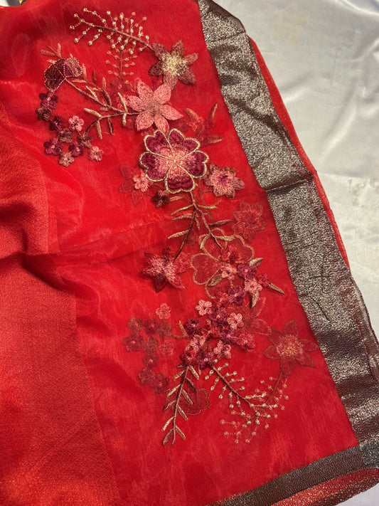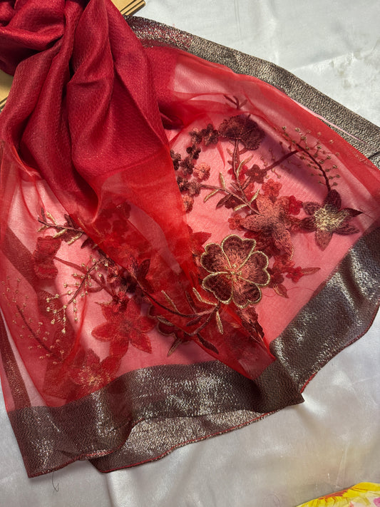 Rose Embroidered Organza- Luxury Hijabs- Red