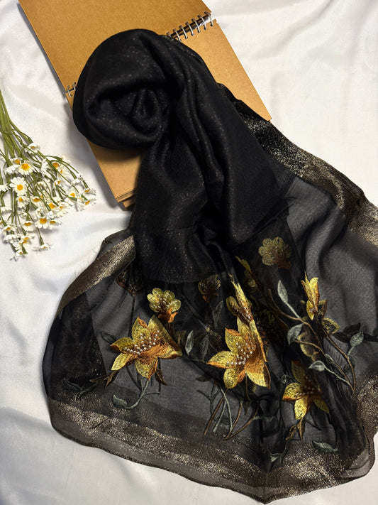Lilies Embroidered Organza- Luxury Hijabs- Black