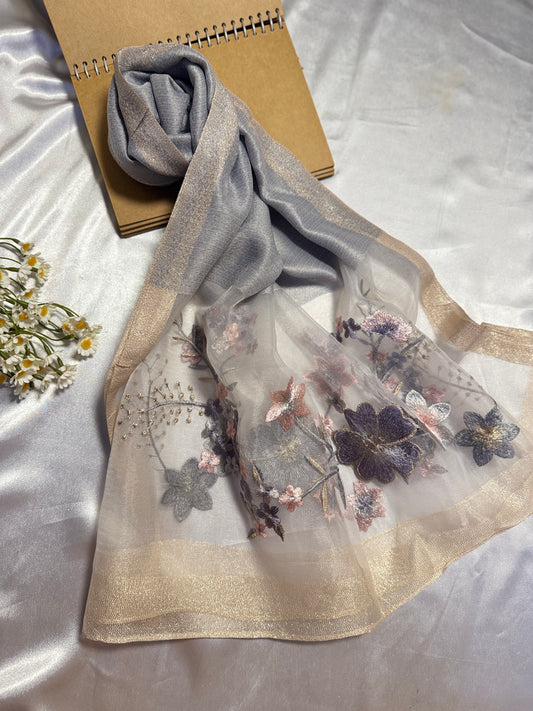 Rose Embroidered Organza- Luxury Hijabs- Silver