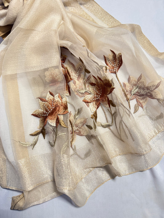 Lilies Embroidered Organza- Luxury Hijabs- Nude Gold