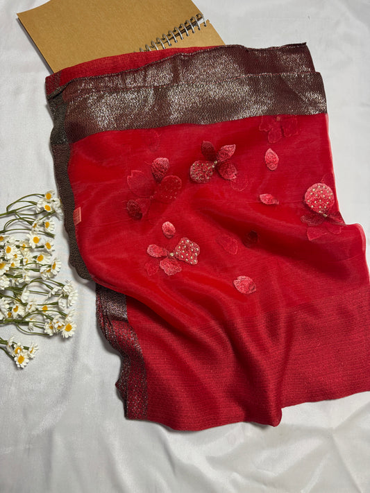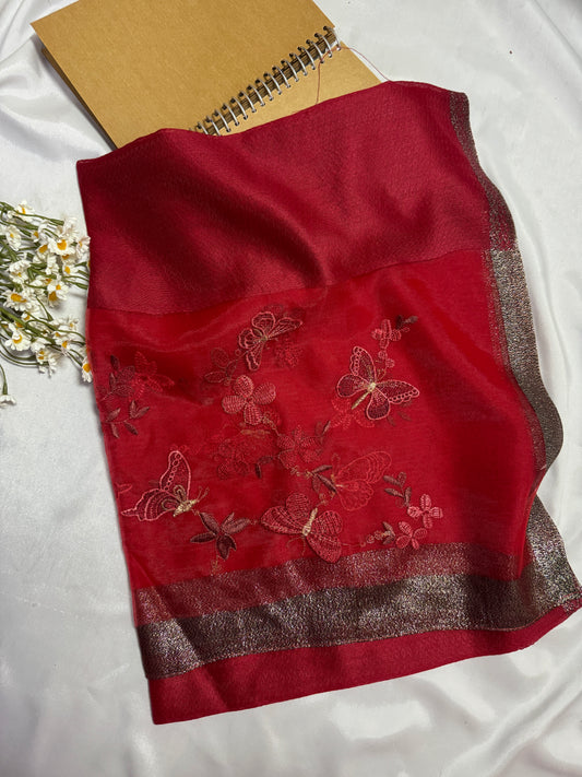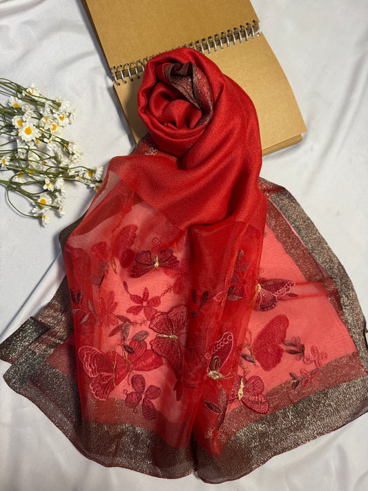Butterfly Embroidered Organza- Luxury Hijabs- Red