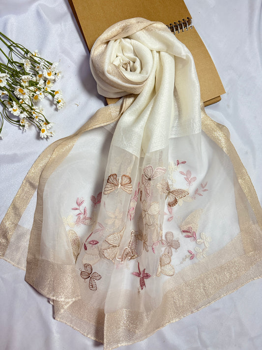 Butterfly Embroidered Organza- Luxury Hijabs- White