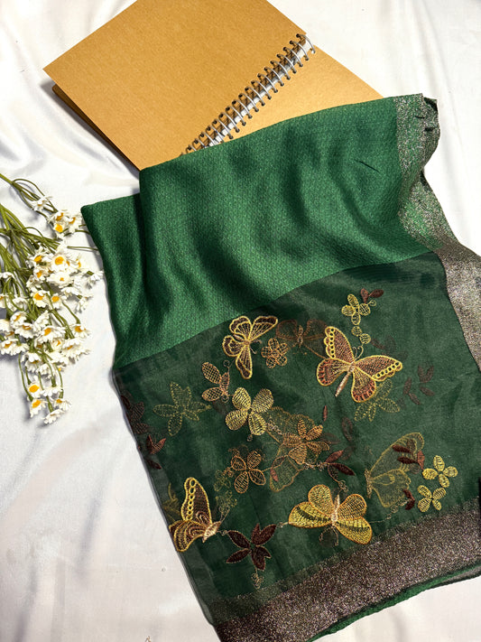 Butterfly Embroidered Organza- Luxury Hijabs- Dark Green