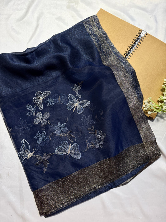 Butterfly Embroidered Organza- Luxury Hijabs- Navy Blue