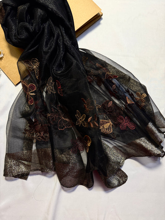 Butterfly Embroidered Organza- Luxury Hijabs- Black