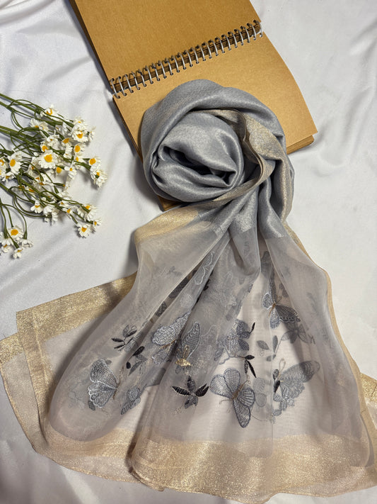 Butterfly Embroidered Organza- Luxury Hijabs- Silver