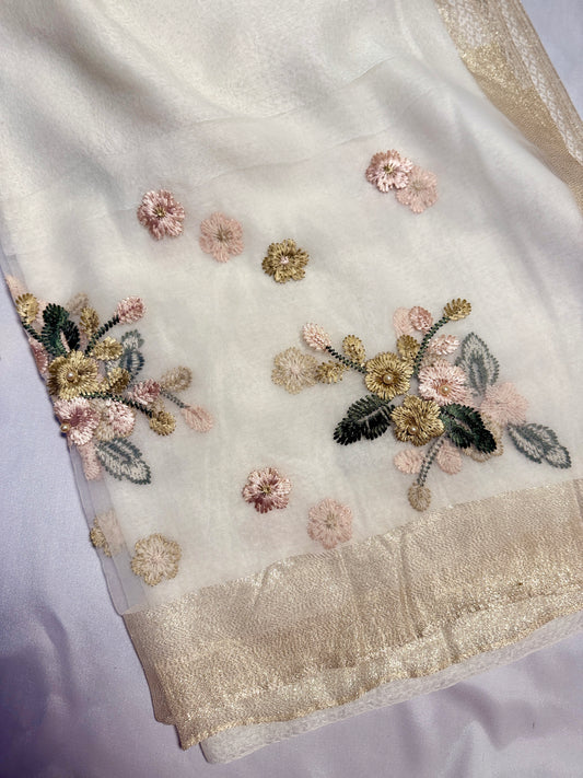 Pearl Floral Embroidered Organza- Luxury Hijabs- White