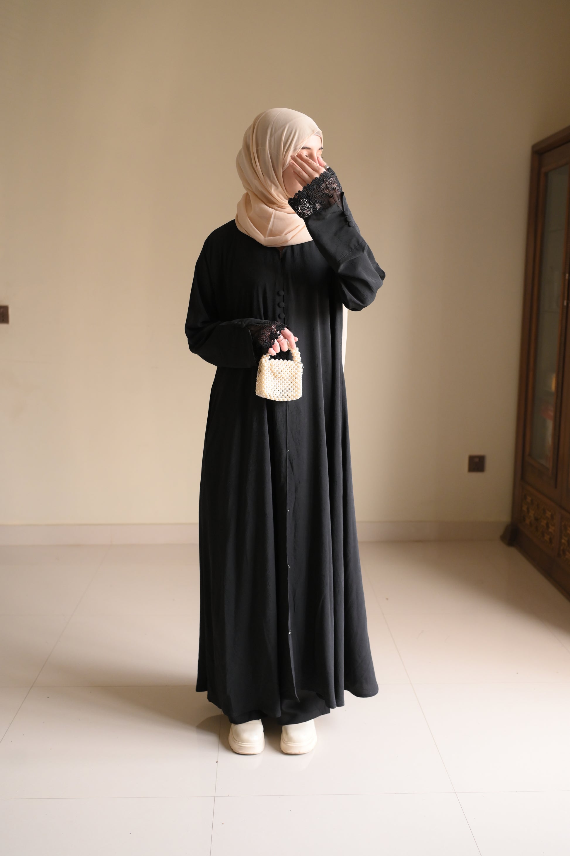- Style: Coat-style design offering structured elegance and modern modest fashion