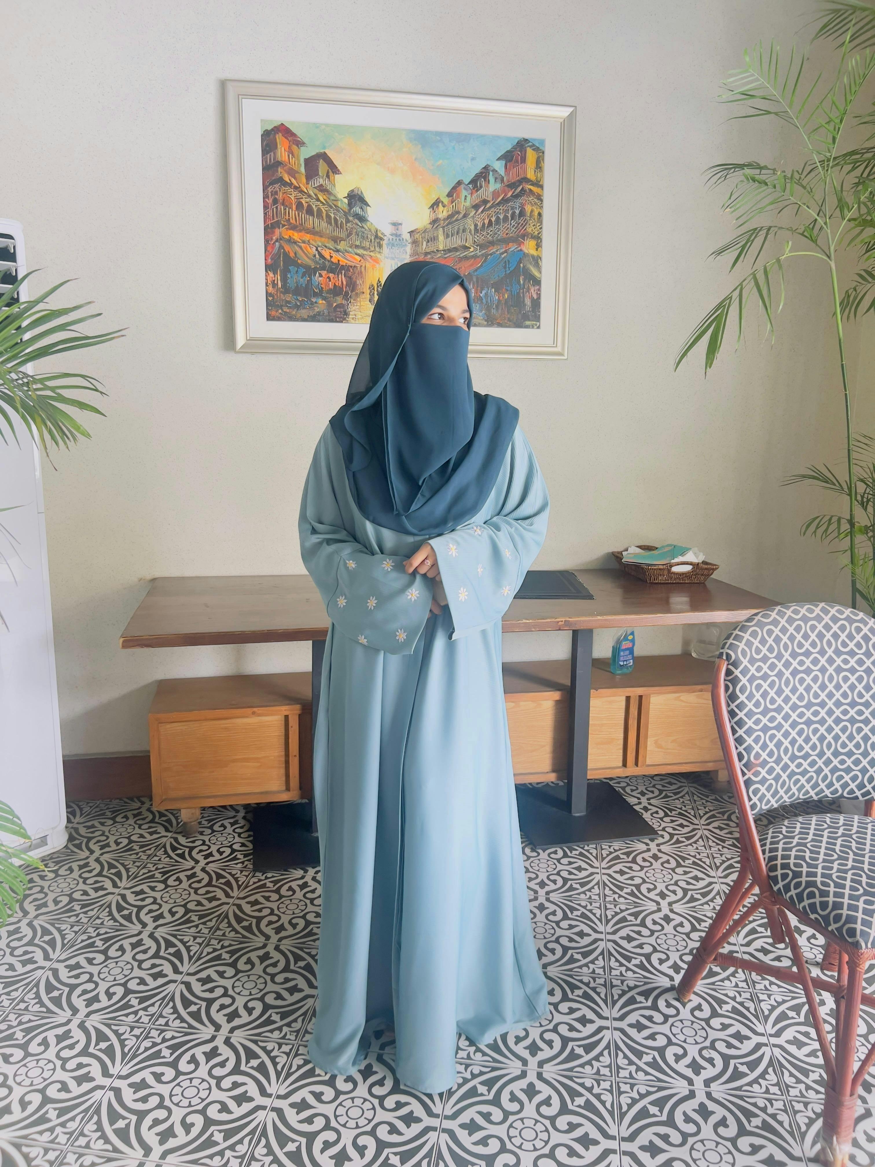I am so in love with this abaya its colour texture and the flare is so good and i was loving my look, also i wore it at BME meetup and abaya was giving such a boss lady vibes 🩵