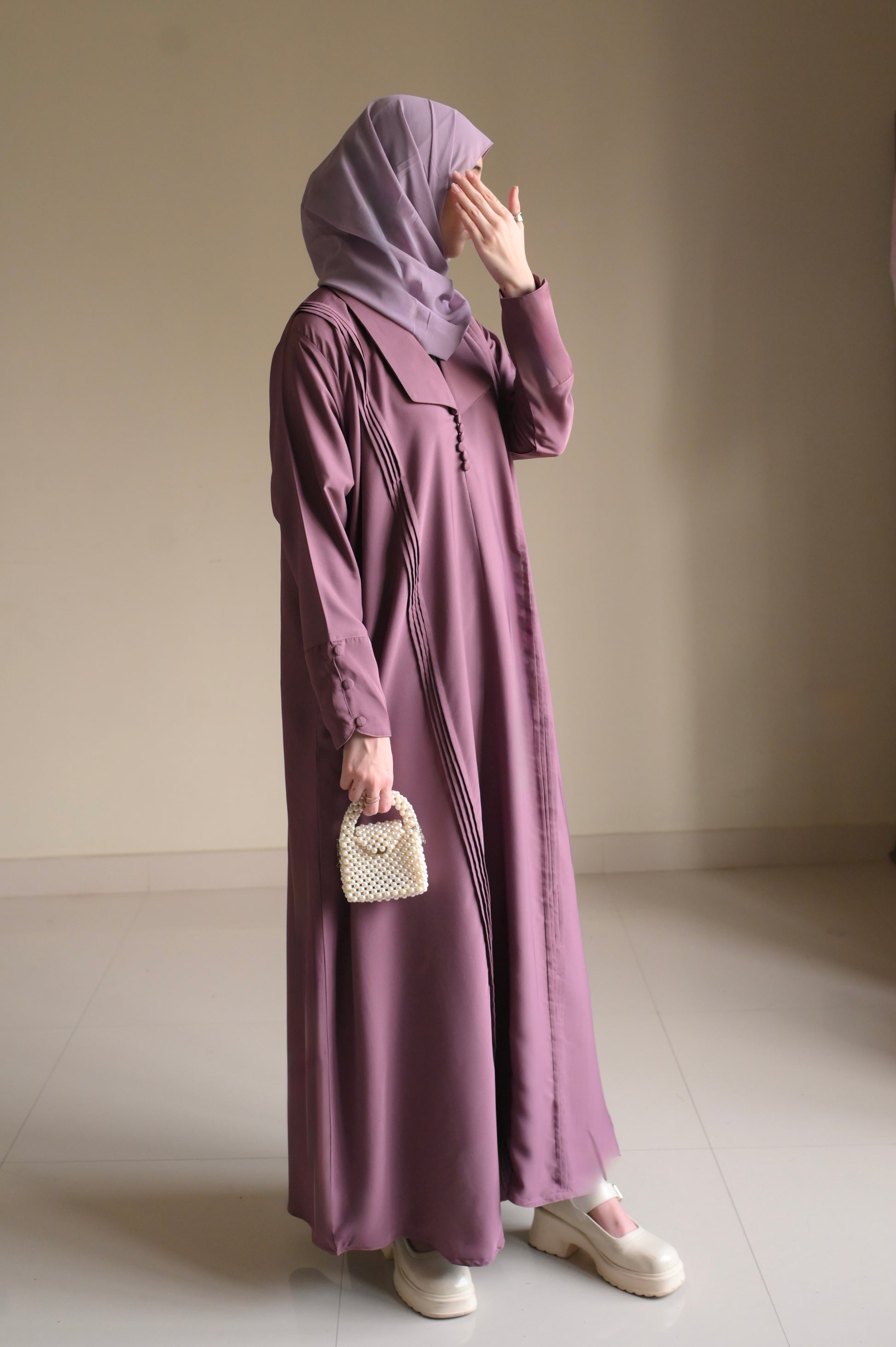 Featuring a classic collared neckline and pleats cascading from the shoulders to the bottom, it offers a structured yet graceful silhouette that flatters all body types. The front showcases button detailing for a refined look, while remaining fully closed for complete modesty.