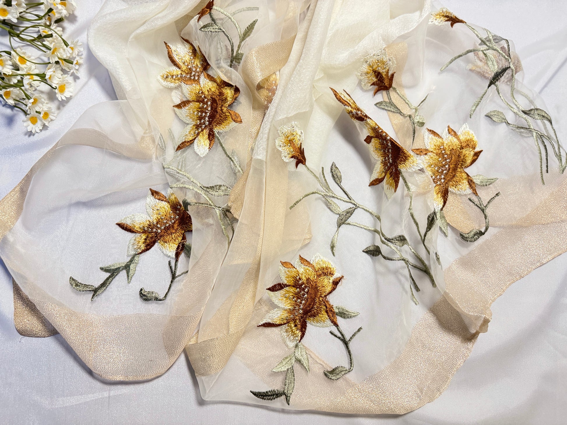 Lilies Embroidered Organza- Luxury Hijabs- White