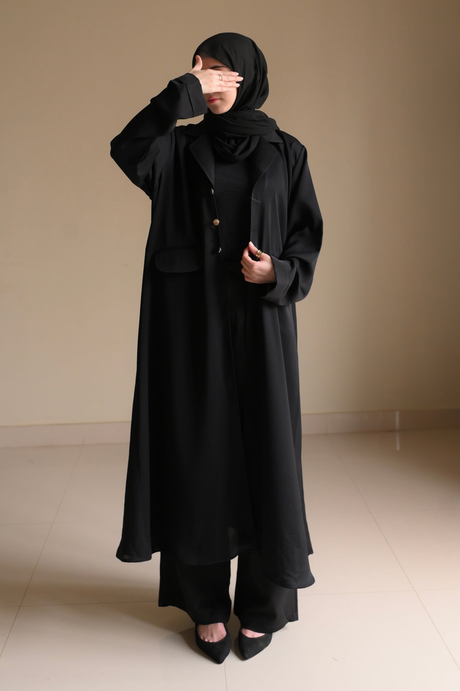 Elevate your winter wardrobe with our Black Knee-Length Coat Abaya, crafted from premium Nida fabric for a soft, luxurious feel. The knee-length design offers elegance and versatility, making it perfect for layering over pants, camisoles, skirts, or inner abayas. Designed with a classic collar, flap pockets, and flap cuff sleeves with gold button detailing, this abaya combines modest fashion with contemporary style. Its flowy A-line silhouette and premium luxury cut ensure a flattering fit while keeping comfort a priority. Ideal for everyday wear or formal occasions, this coat abaya is a must-have winter luxury staple.