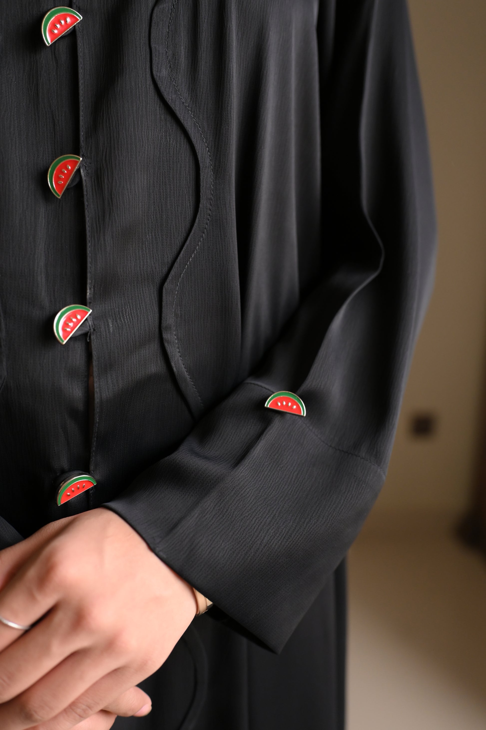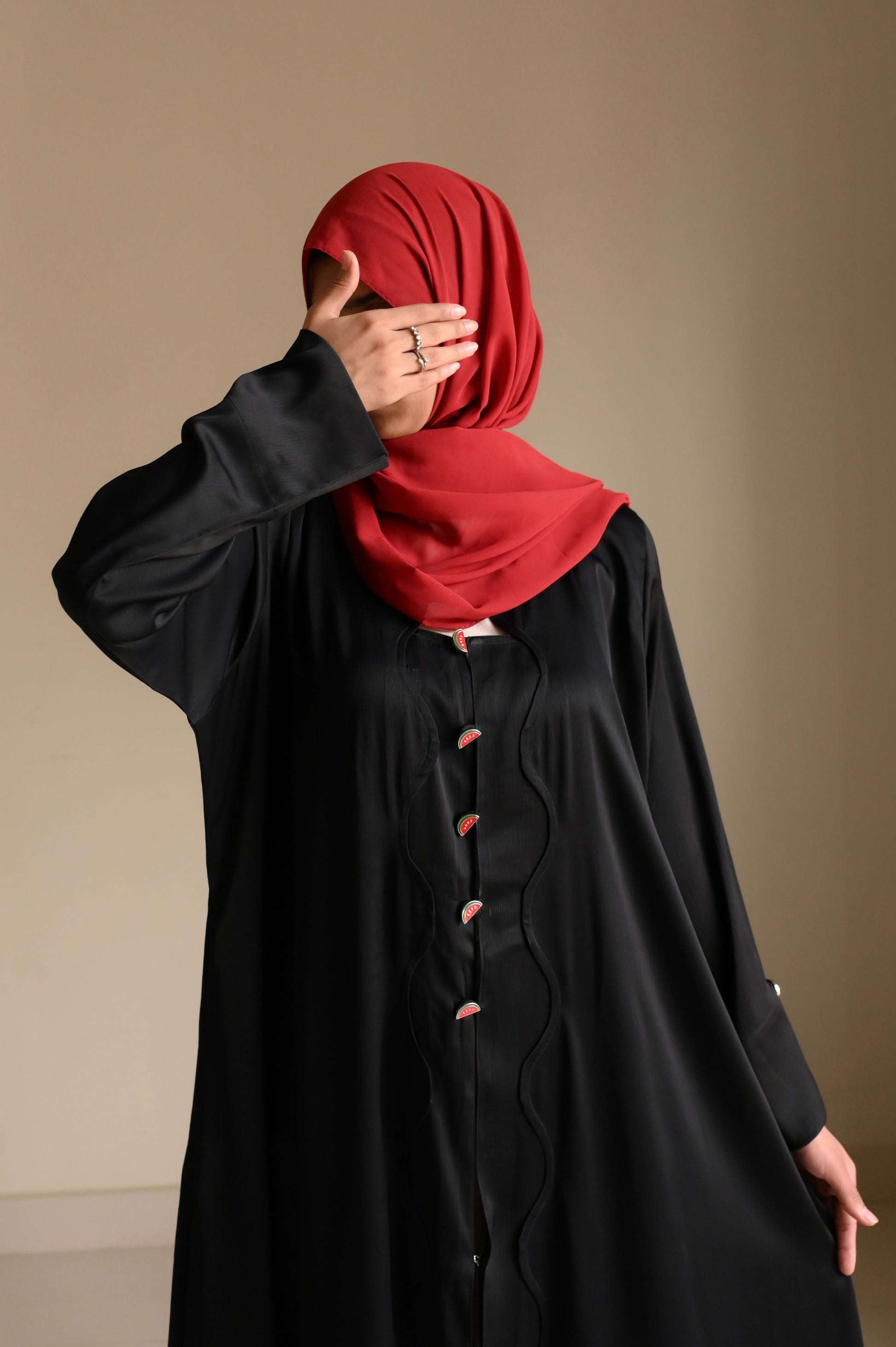 Embrace elegance with a purpose with our Luxury Romantic Nida Abaya – Watermelon Resistance. Crafted from premium luxury romantic nida fabric, this abaya is designed not just for style, but to honor resilience. Inspired by the enduring spirit of Palestinian resistance, the subtle watermelon-colored buttons pay tribute to hope, strength, and the unyielding fight for freedom.